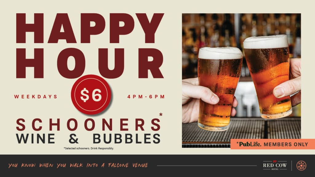 $6 selected schooners, wine & bubbles on weekdays from 4pm – 6pm. Available to PubLife members only.